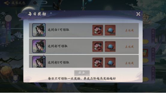 (3)每日礼,每天只可手动领一次,按照养成星级设置奖励