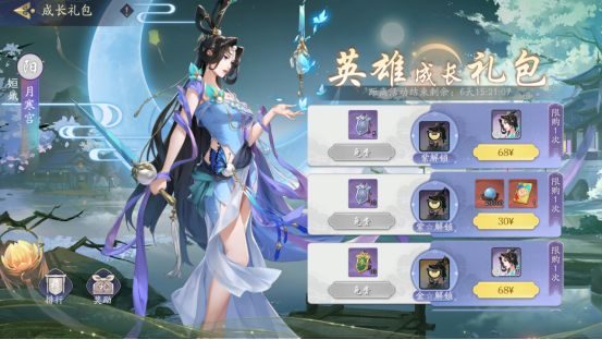 68元的阳刺本体1张,6元、68元、……月枝礼包以及阳刺养成礼包