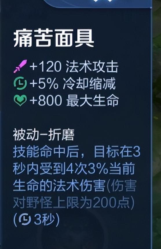 注意,下面的面具特别关键,痛苦面具可以直接让敌人受到当前生命值的法术伤害,快速压低敌人的血量,方便你之后的鲨嘴炮斩杀,消耗能力瞬间拉满了。