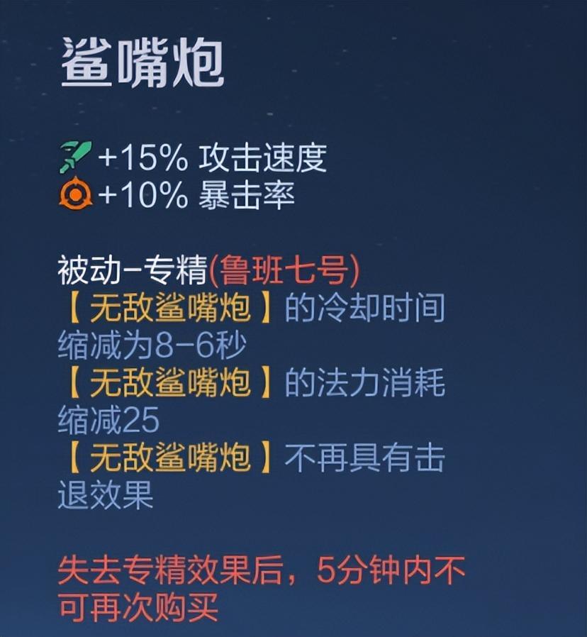 无敌鲨嘴炮的属性不差,攻速、暴击、移速全占上了,俨然是给鲁班补足了关键属性。
