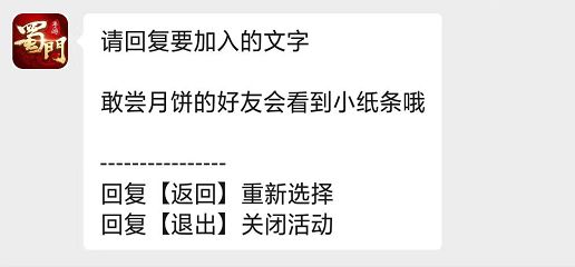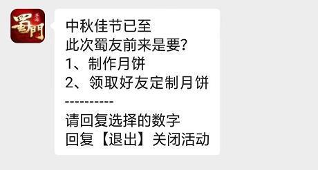1、来到《蜀门》手游公众号后台(以下界面)在此处发送月饼两字即可参加活动;