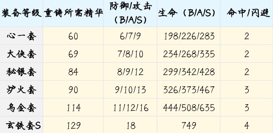 中期:心一到炉一,打造大侠套和秘银套并重铸B或A,或捡属性高的威虎山副本装备。