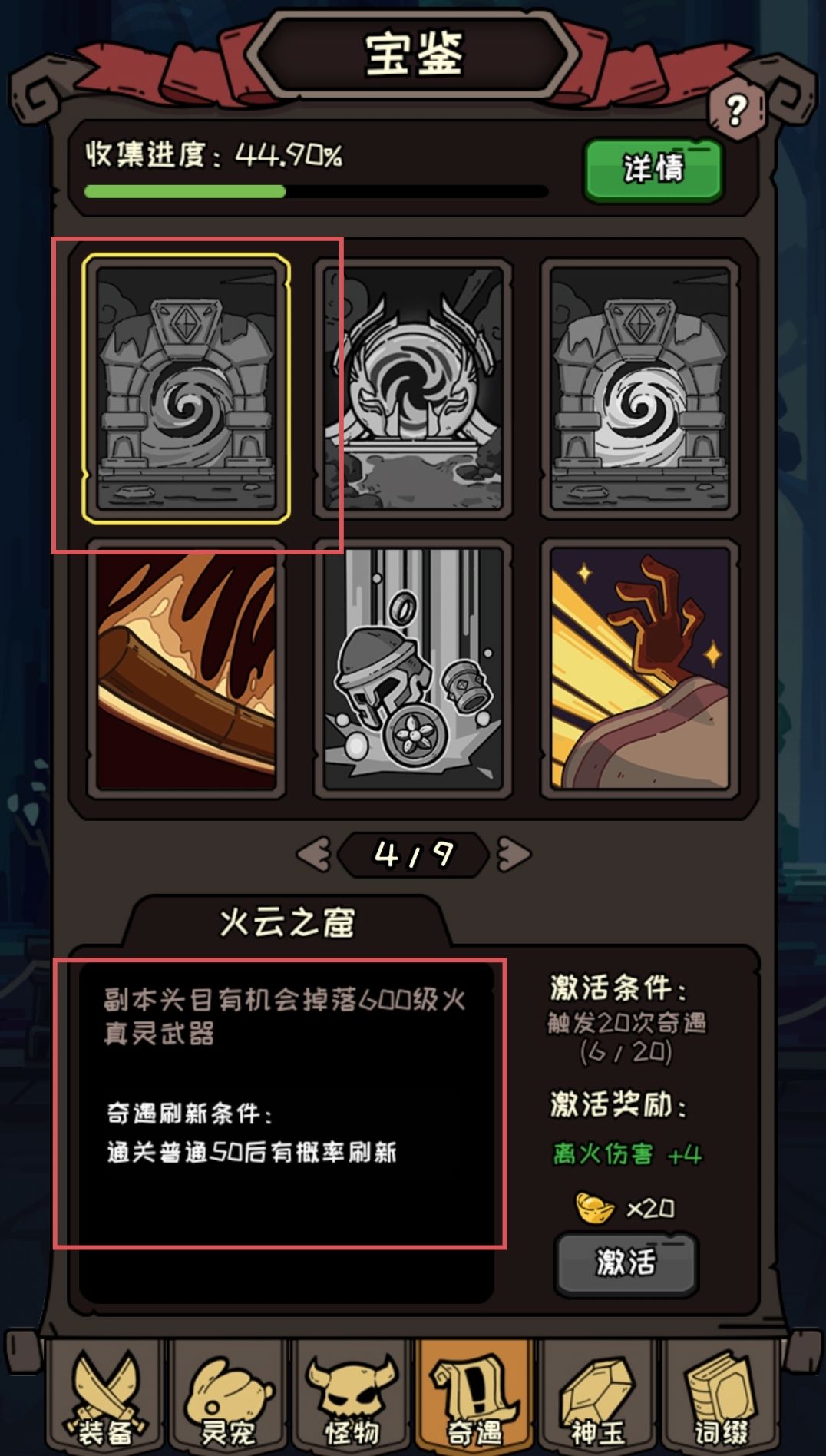 第三类奇遇是副本探索,副本探索事件中有三种不同的副本类型,包括资源副本、领主副本、真灵副本,获得的奖励分别为经验铜钱、稀有材料(白冠花球)、稀有装备,以及唯一掉落的真灵武器。 火真灵副本的敌人免疫火真灵伤害,记得使用别的真灵攻击。(本系真灵副本免疫本系伤害和物理伤害)