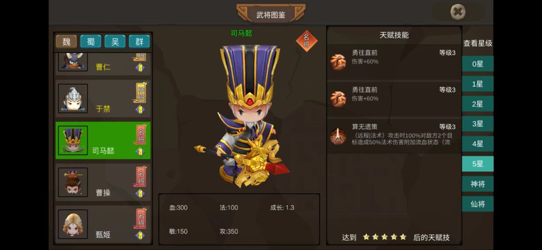 缺点:养成周期过长,没到仙将基本发挥不了他的作用,很弱,所以前期一定不要主要培养司马懿。(在游戏进行到10天,白虎刷满500只会得到白嫖的一颗仙将丹,此时对于白嫖玩家可以选择仙司马懿,前提是每天坚持打张角)