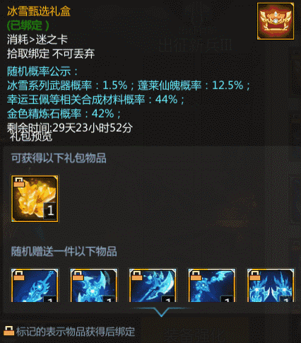 ①冰雪甄选礼盒,大家有机会从中获得冰雪系列武器,定价60梦三币,期间限购99个。