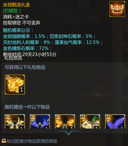 ②坐翅甄选礼盒,大家将有概率获得坐骑和翅膀,定价60梦三币,期间限购99个。