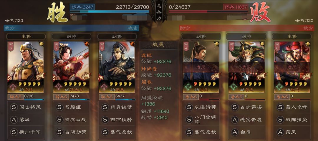 一般凌统搭配的队伍是快速爆发队伍,携带作战系的胜战和执锐能更好的补充伤害。