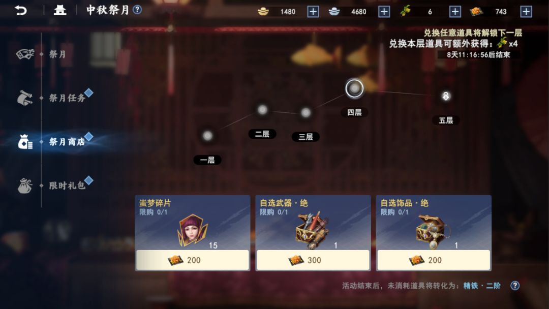 完成祭月任务获得【金桂月饼】,可以兑换珍稀道具武备令,蚩梦碎片,蚩梦专属武器和专属饰品等奖励。第5层可以兑换聚灵丹,归灵液,需要注意的是,兑换本层任意道具才能解锁下一层。