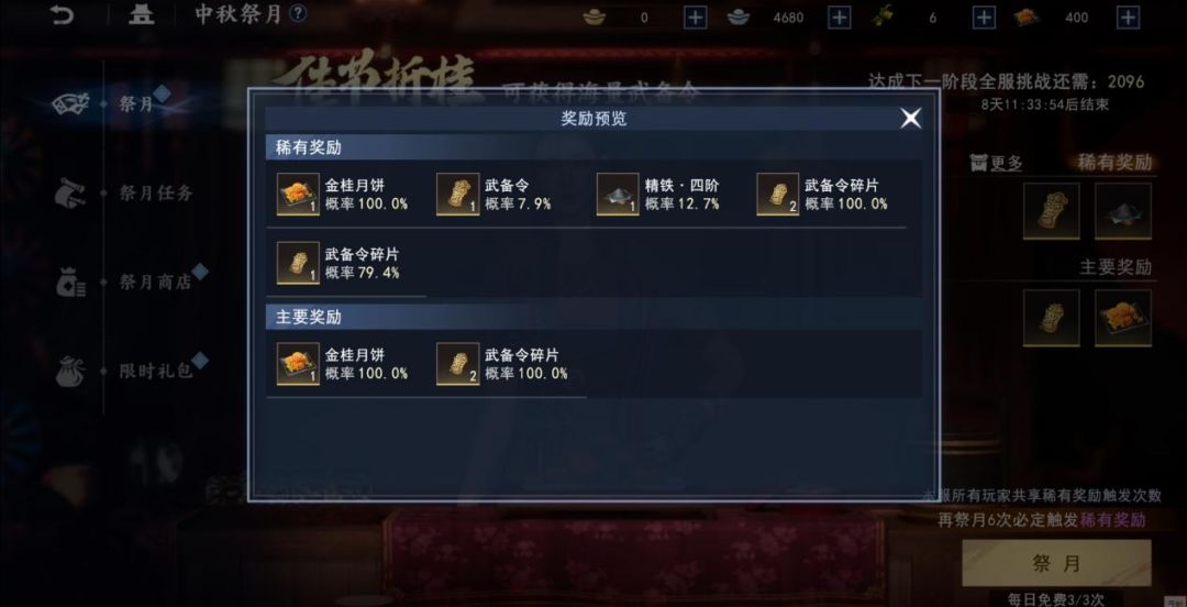 1、完成指定次数的祭月,即可领取大量武备令奖励。