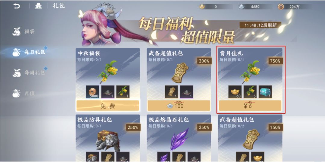 活动期间,每日购买6元【赏月佳礼】既有概率获得绝品侠客蚩梦,购买路径礼包-每日礼包,每日限购1次。