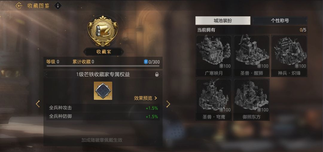 并且领主大人们在凤鸣九天活动中收集城池装扮以及个性称号后,还能获得对应的收藏积分,累计的积分可升级收藏家等级,获得对应的领主徽章,激活专属不限时buff!目前只能通过凤鸣九天活动获取收藏积分哦。