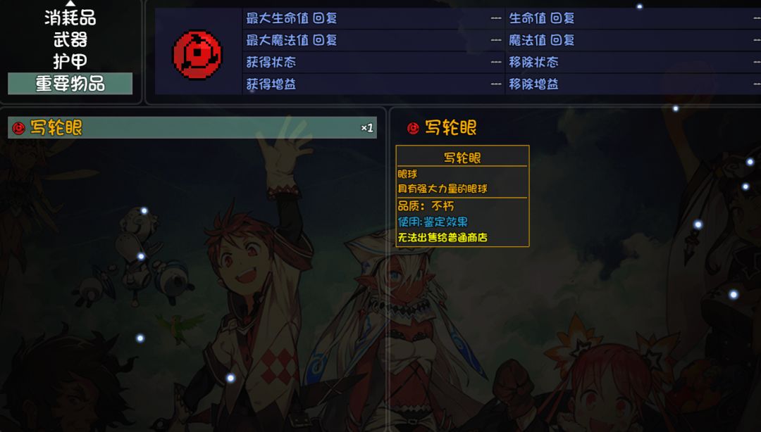 特殊的装备,需要鉴定其效果才能使用,可获得不同的能力如天照,月读,神威等..