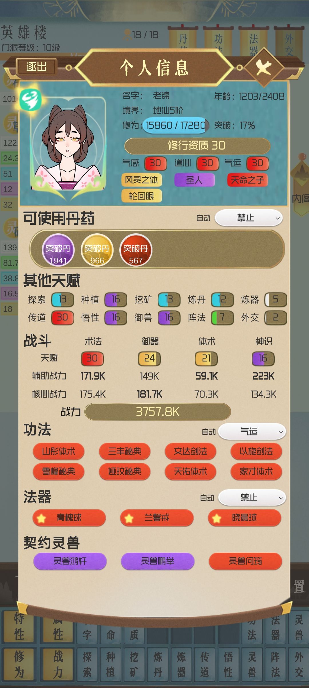 (图片:独孤明辉为中间头上有“城镇”字样那位,四周有三个“暖心”技能加成修炼速度,同时英雄楼有2位圣人加成,修炼速度292/年)
