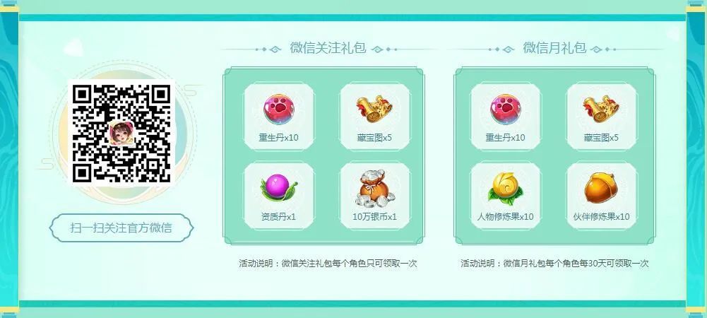 逍遥百闻遍三界,关注微信一手抓。想要了解游戏第一手更新情报,关注官方微信公众号认准可爱的瑶瑶准没错!关注公众号后不仅可以领关注礼包,每30天还可领取一次月礼包呢。