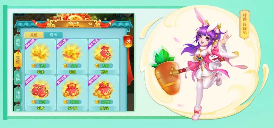 游戏中每档元宝首充都是双倍回馈的!完成第一笔首充还可获得一只珍兽玲珑兔,她是咱们新手开荒的优秀伙伴,有了她在副本挑战中会更加轻松。