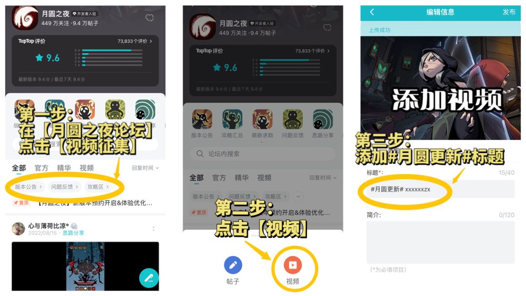 卡牌大师可在TapTap【月圆之夜】论坛进行投稿视频,选择论坛子版块【视频征集】直接发视频,在视频标题中加入标签 #月圆之夜自走棋,并将视频在社区中发布,即视为参与活动。