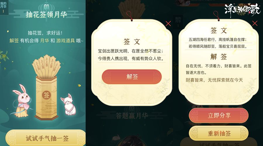 《浮生为卿歌》双节盛典今日浓情开启,仪式感满满的抽花签活动静待阁下前来体验!活动从9月9日上午10点准时开启,至10月9日24点结束,每日求签的次数没有限制,每日首次解签签文后,更有月华和随机虚拟游戏道具奖励等你来拿。