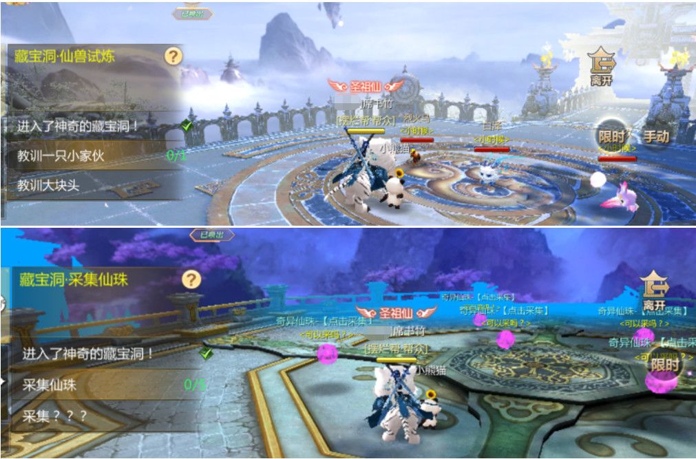 要注意的是,藏宝洞是限时的,倒计时结束后将无法进入。藏宝洞分为【采集仙珠】和【仙兽试炼】,玩家会随机进入其中一种。所有仙珠采集完毕,场景内所有玩家将获取一次领奖资格;藏宝洞BOSS被击杀后,场景内所有玩家将获取一次领奖资格。拥有领奖资格的玩家可以点击宝箱获得奖励。(每人单场只能获得一次宝箱奖励)
