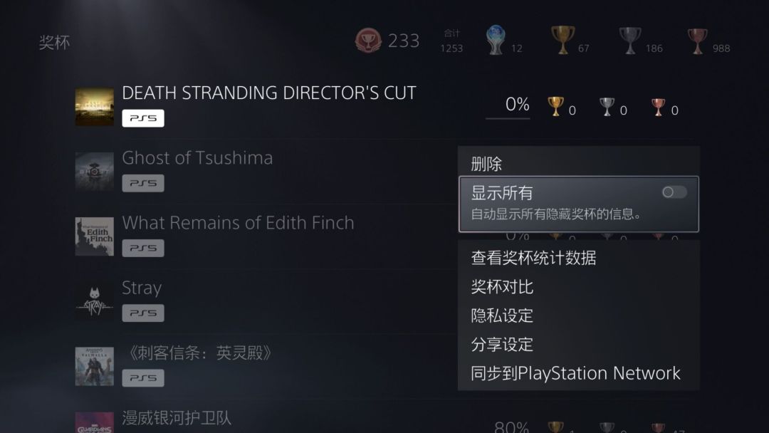 玩家在奖杯页面按选项键,即可显示所有隐藏奖杯的信息。不过其中可能会包含一些有关剧透的信息,怕剧透的玩家谨慎使用。