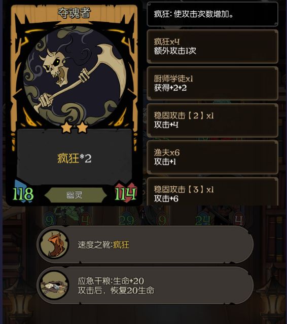 前期:夺魂者作为一张2星卡牌,较容易合成金卡,其2/10的初始面板能够较为轻松地度过前期。由于其初始攻击仅为2,需要为其提供攻击成长。
