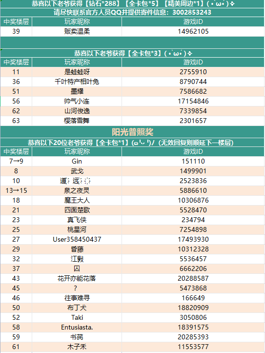 中了实物周边的老爷请添加官方人员QQ:3002853243,并附上您的昵称、地址及联系方式,以便我们尽快发奖~再次感谢!
