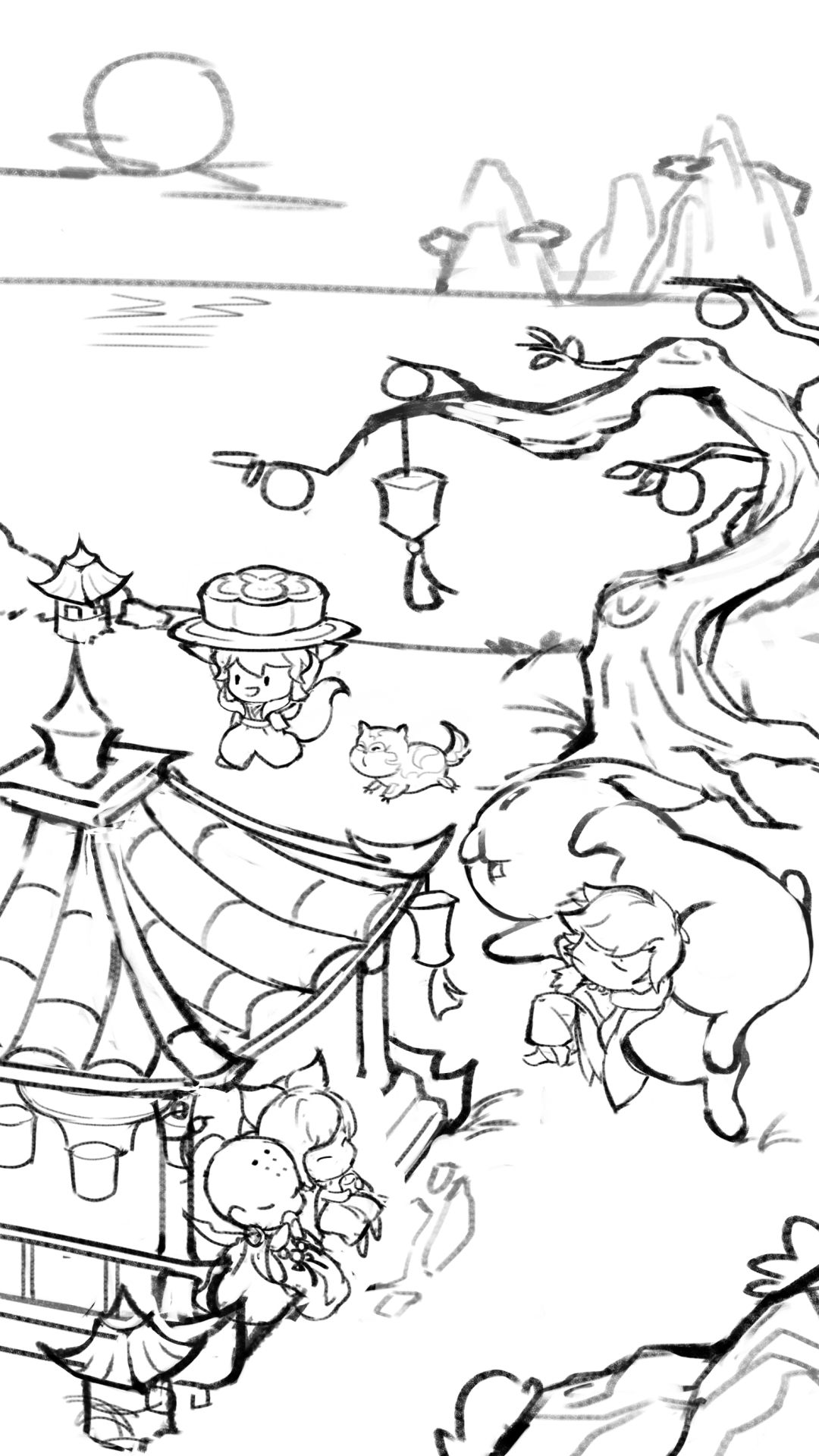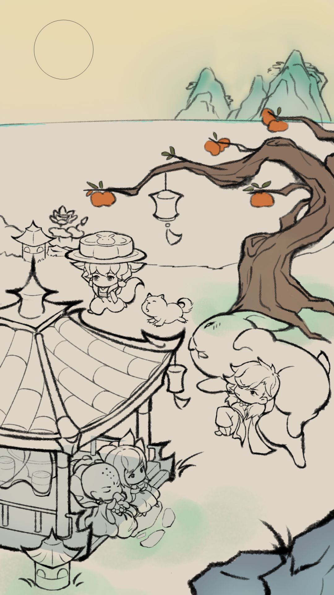 最后:给月亮加上倒影,点上更多灯火,放飞一些孔明灯,增加节日的氛围,完善细节,小兔子团团来几只,来点灵魂佐料....出锅啦!