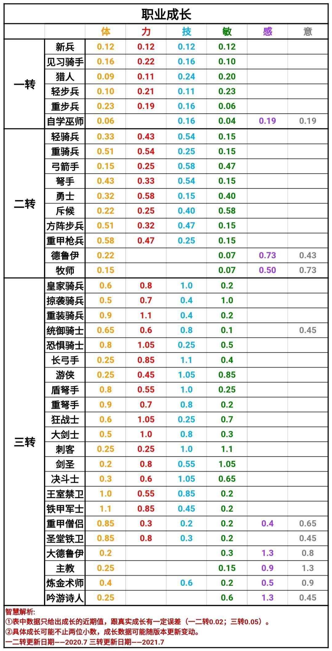 传家宝将会根据人物的潜力和职业综合起来的成长比例去填充属性,大概数值如下图,这个阶段只需要搞懂哪些高,哪些低,然后根据转职需求做对应的传家宝(需要注意的是:有些武器新兵拿不了,盾加不了属性)
