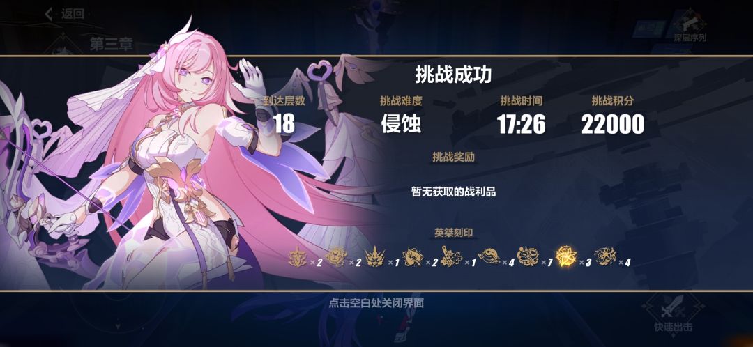 我人都麻了,打那么长时间。总感觉伤害不够啊,是不是我武器还没升满?所以伤害不够,我照着攻略选的,但是人家打最后一关12分钟,我倒数第二关还要打17分钟,人都给打麻了,第一次奖励全拿,
