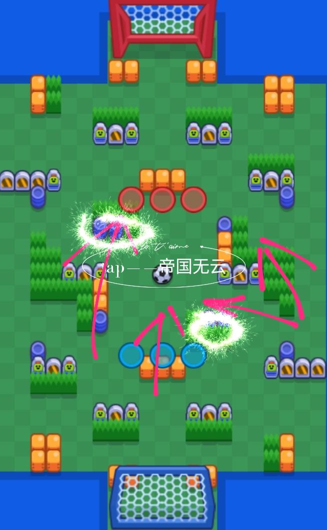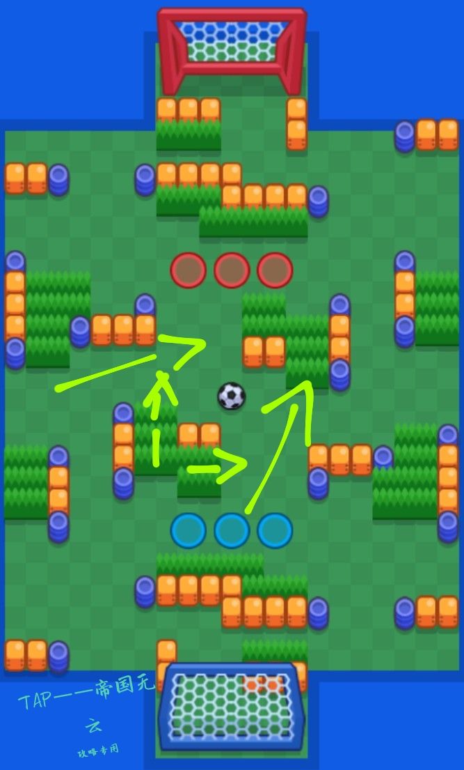 另外两个英雄从侧边顺着箭头进行压制的攻击即可。这个图球门前的长型障碍物虽然长,但是只要敌方有破墙的英雄,这个障碍物消失之后,整个球门就会变得十分空旷。所以,对我方进攻来说,一定要破坏敌方球门前障碍物,同时一定要避免我方球门前的障碍物被破坏。