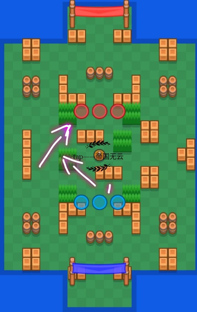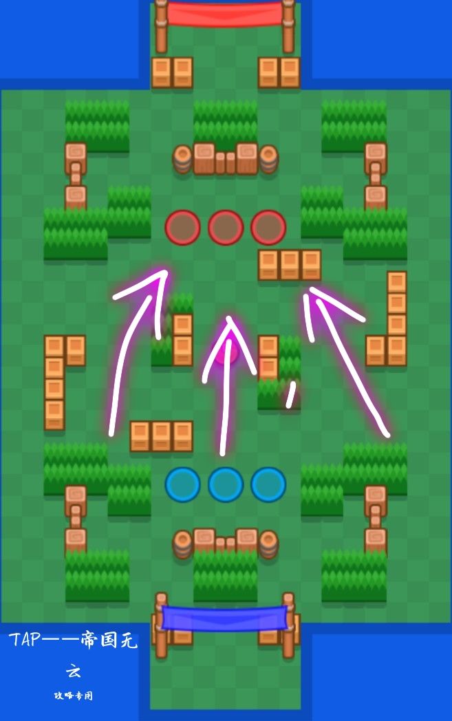 三个英雄绝对不能一起从草坪处走出,三个英雄一人选一个位置分别从三个出口出场。中心位置留给aoe英雄,直接突前对敌方从中间走出的英雄进行强力压制,如果敌方三个英雄都从中间出场,那么效果会极好。