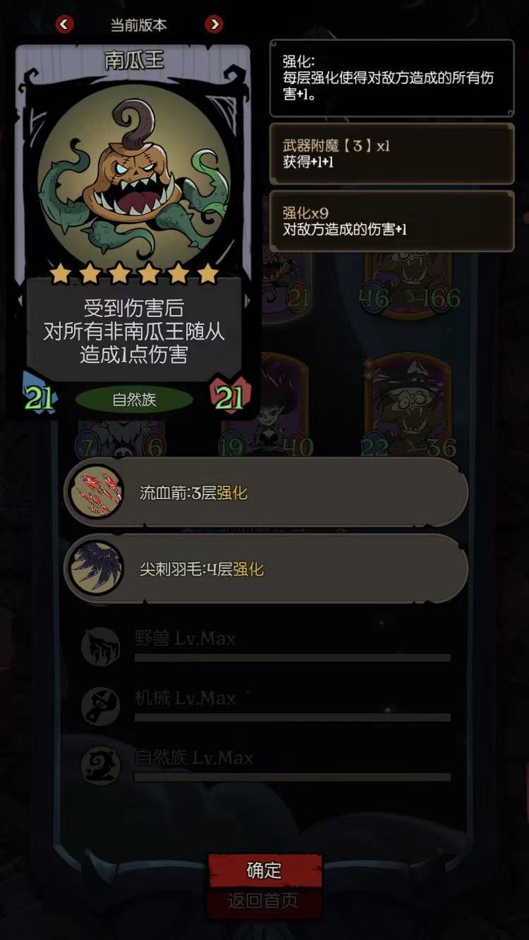 三是强化buff,通过装备,升级奖励,中立怪给上的强化buff获得都可以,如果后期没有“南瓜王”,中立强化光环怪是优先级很高的,如果有“南瓜王”,可以把所有强化buff集中到“南瓜王”身上。还有一点是由于“南瓜王”和“欲望沼泽”对友方有伤害,所以要计算好大概多少伤害,尽量不要把自己怪给打死了,否则是触发不好效果的,如果大概率会把自己怪打死,请把血少的放前面先触发先手效果。