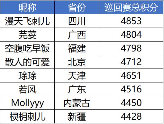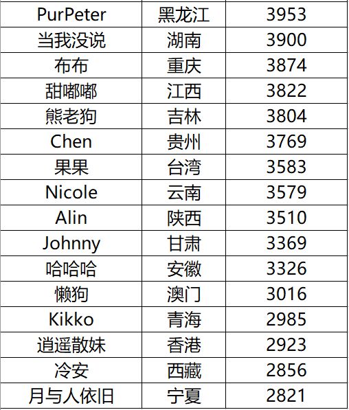 啊,这……上周刚刚预测错误被打过一次,还能再给各位抓住把柄?小编这就给大家表演一个“料事如神”!本周预赛的最高分确实没有突破5000,这也是三周以来首次周预赛冠军分数未高于5000分了,不知道是刚高考完的大家动力不足,还是单纯缺少些运气呢? 本周排名第一的“漫天飞刺儿”来自四川,虽然没有拿到5000分以上,但是能够超过一众高手们摘得头筹也是十分难得!所以到底为啥每次都能散人粉丝都能拿到第一名呢?小编也想去改个名字冲分试试运气~ 第二名是来自广西的4804分选手“芫荽”(yán sui)!下面是UNO小科普:芫荽,别名胡荽、香菜、香荽,是双子叶植物纲、伞形目、伞形科、芫荽属的一个植物种。简而言之,就是香菜啦!对于这种蔬菜,爱它的人可以涮在火锅里吃,恨他的连汤里的一点调味料都无法接受,可能这位选手也是敢爱敢恨的一位狠人?(误) “空腹吃早餐”选手是前八名中唯一一位出现在之前半程战报中的选手了。最后两天里,ta凭借稳定的发挥保持领先,成功获得第三名。希望ta能够吃饱早餐,状态满满的参加我们今天的周赛哦~ 接下来放送的是“福州站”周预赛中拿到各省第一名的选手名单~