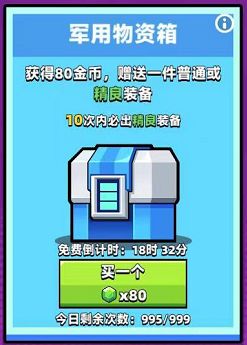 军用物资箱:开箱便可获得80金币,大概率赠送一件普通装备,有机会获得精良装备,开箱十次后必出精良装备。