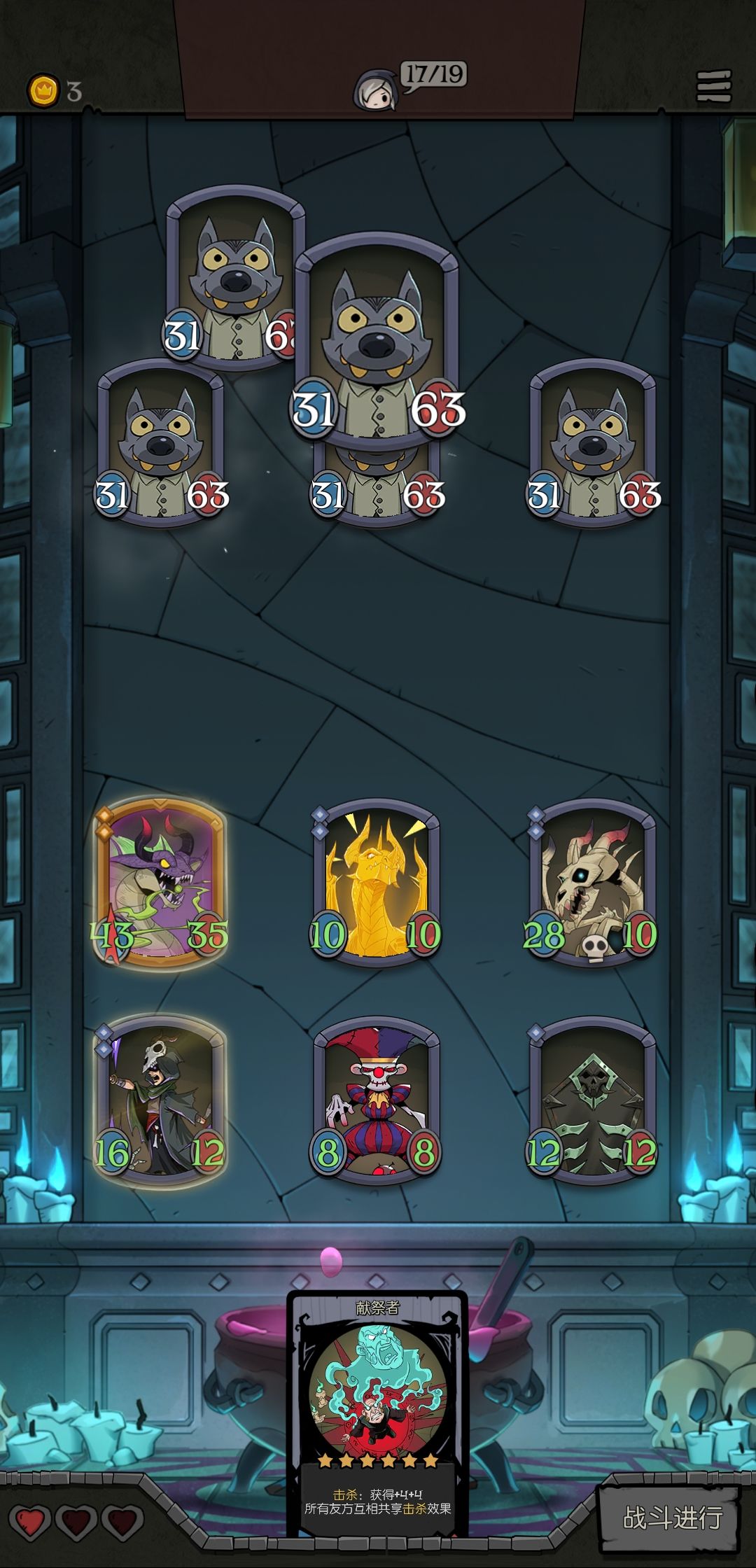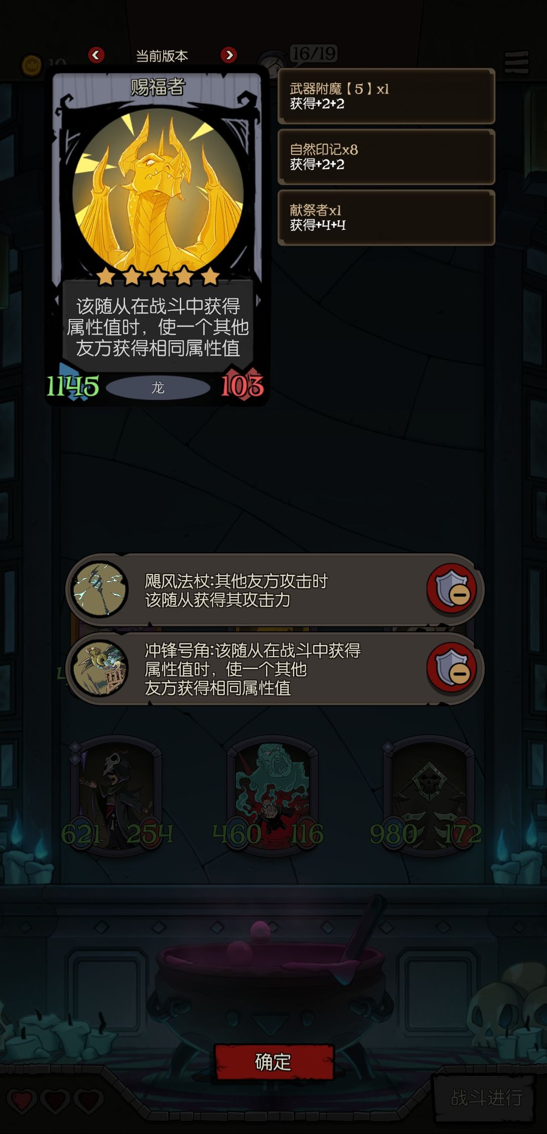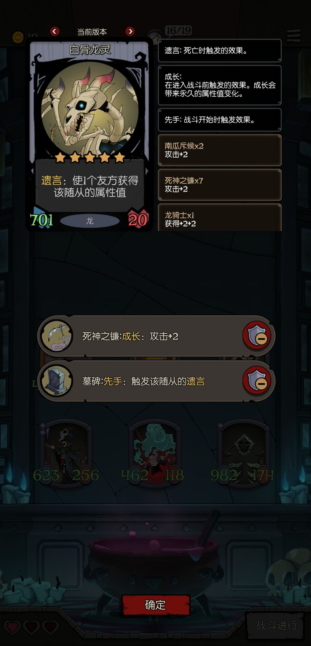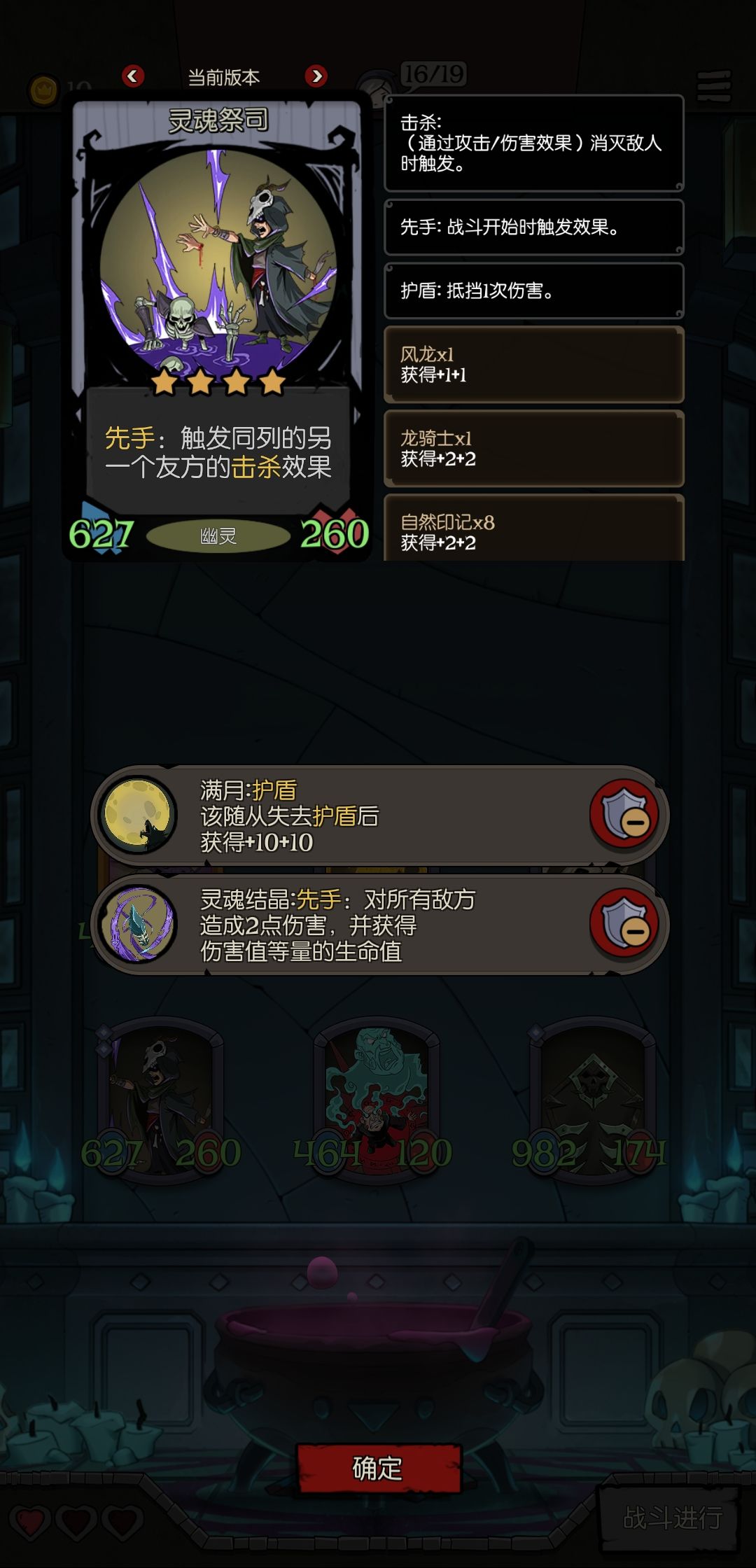 主要思路是在战前通过灵魂祭祀的先手效果触发幽龙的击杀效果,再用幽龙的击杀效果出发白骨龙灵的效果开始buff,再通过赐福者的共享属性增幅效果将怪的身材叠的非常大