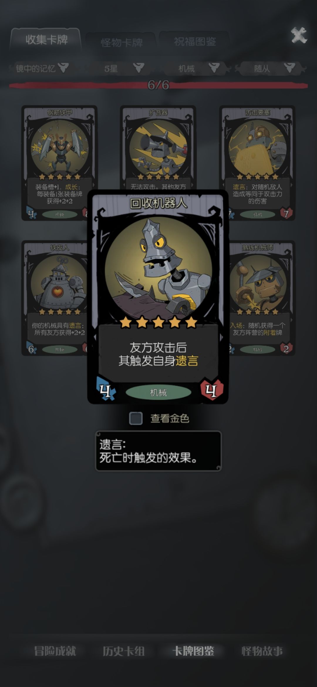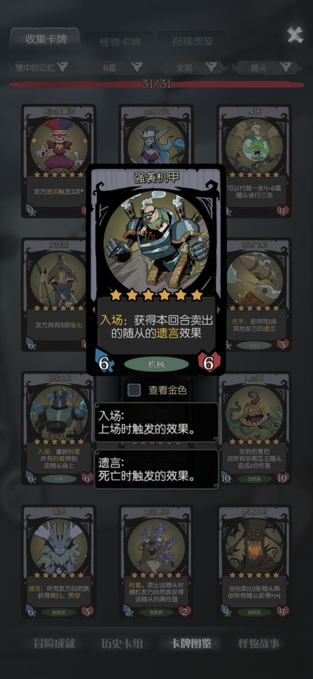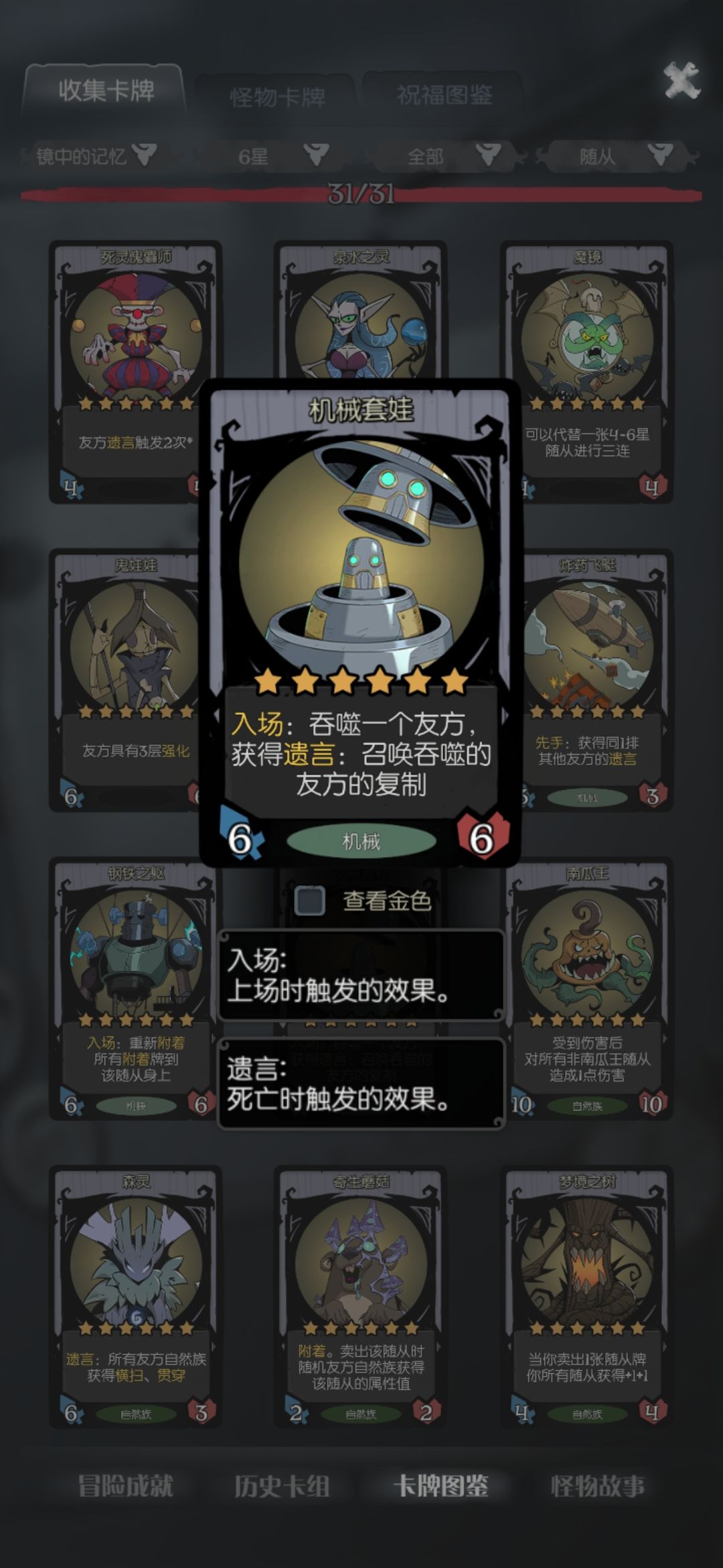 这一套阵容比较适合直接升星到六星,普遍都在12回合左右升到六星,核心是在一回合中开出强袭机甲的需要亡语,然后用回收机器人或者死灵傀儡师让遗言再次翻倍。如果手上实在没有强袭机甲就需要用套娃吃掉一个大哥,最后再用套娃吃强袭,或者卖掉套娃让新的强袭获得套娃的亡语,没有完全成型前可以用飞艇复制套娃的亡语,实现套中套,搭配龙的遗言和幽灵的灾厄南瓜使用起来更好玩