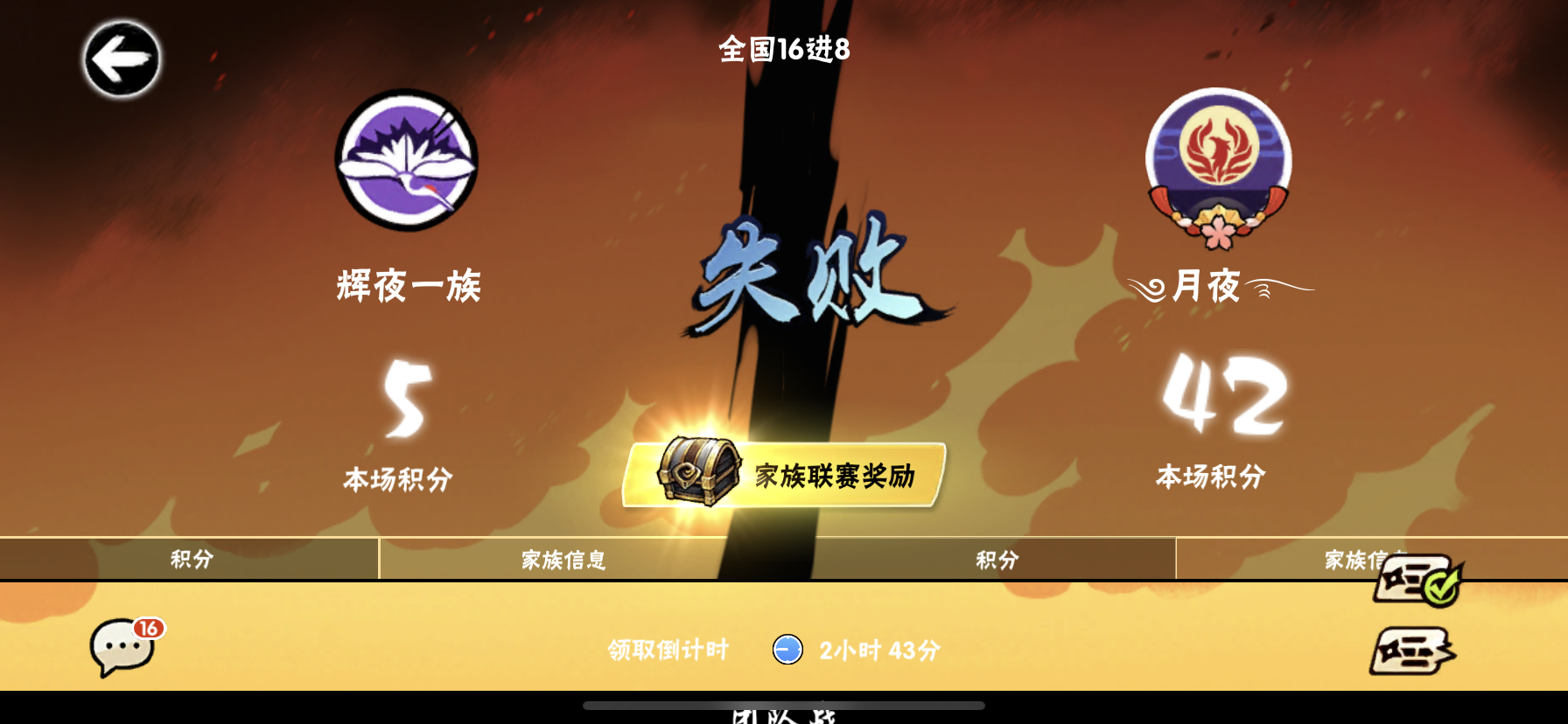 辉夜一族止步16强,回想刚进入家族的时光(一个月hhhqwq),见证过家族的成长(虽然时间不长),家族里面qq聊天和谐,看见过族长四叶以及各管理层的管理机制,还是十分好的(不知道该用什么词语形容了qwq)