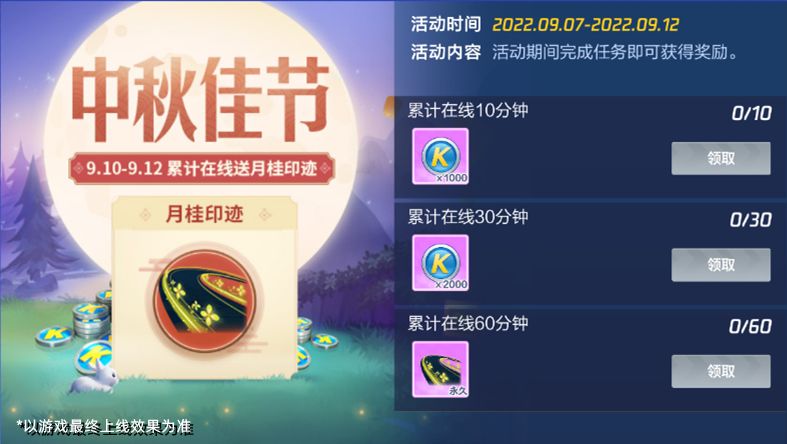 活动中心现已开启【中秋佳节】在线送印迹活动,活动期间车友们累计在线时长达到任务要求,即可领取大量酷币以及月桂印迹。