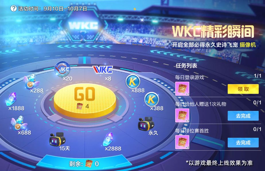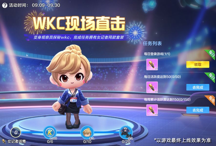 9月9日福利站已开启【WKC现场直击】活动,活动期间车友们完成指定阶段任务即可获得永久赛事主播套装(女)。