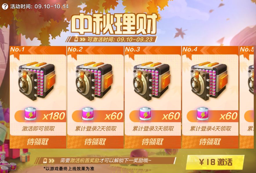 福利站现已开启【中秋理财】活动,9月10日-9月23日理财激活时间内,车友们可直接支付激活理财,支付成功后可立即获得第一档电池奖励。活动时间内,完成累计登录天数任务即可解锁对应奖励。