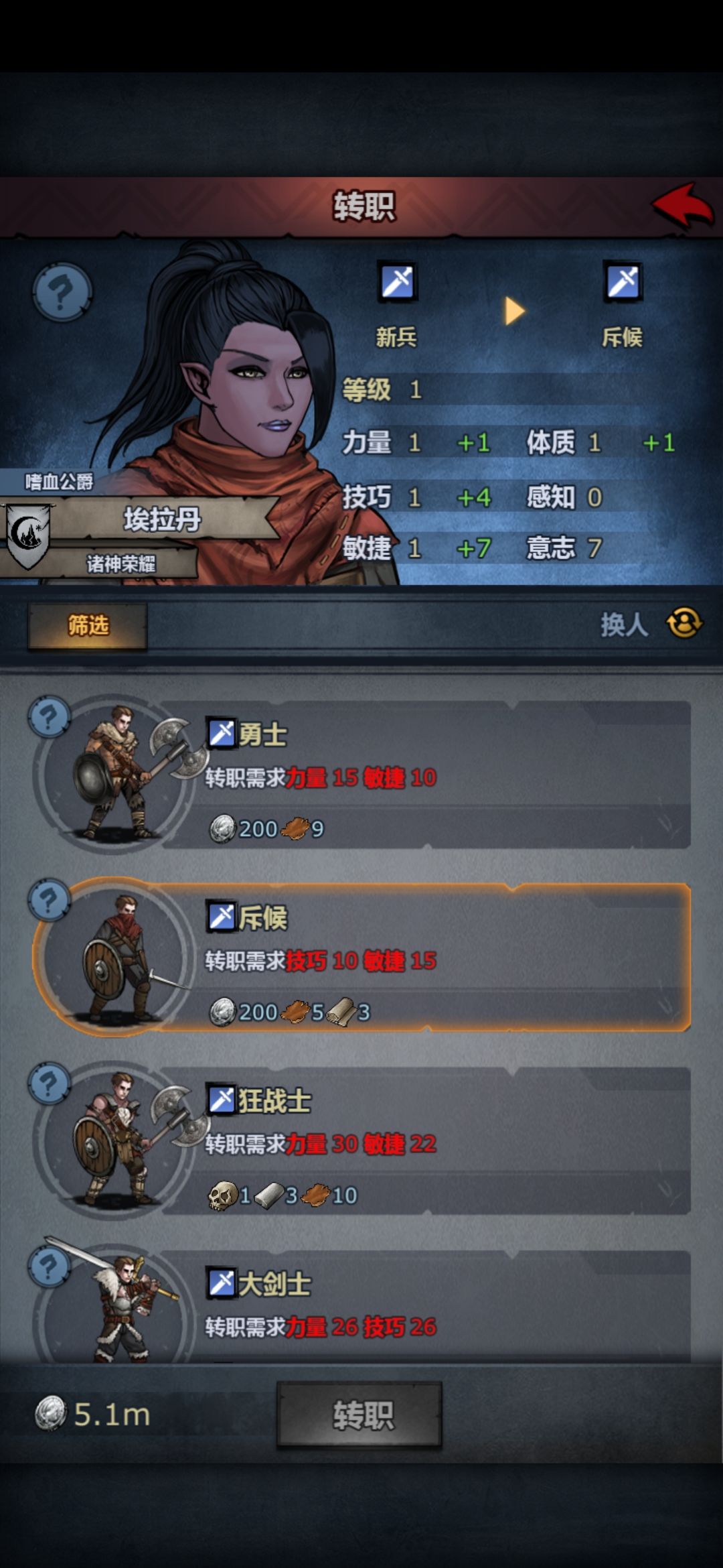 (因为敏属性前期不容易得,基础圣痕也没有加敏属性,所以选择斥候,当然也可以选勇士,只是一个思路。)