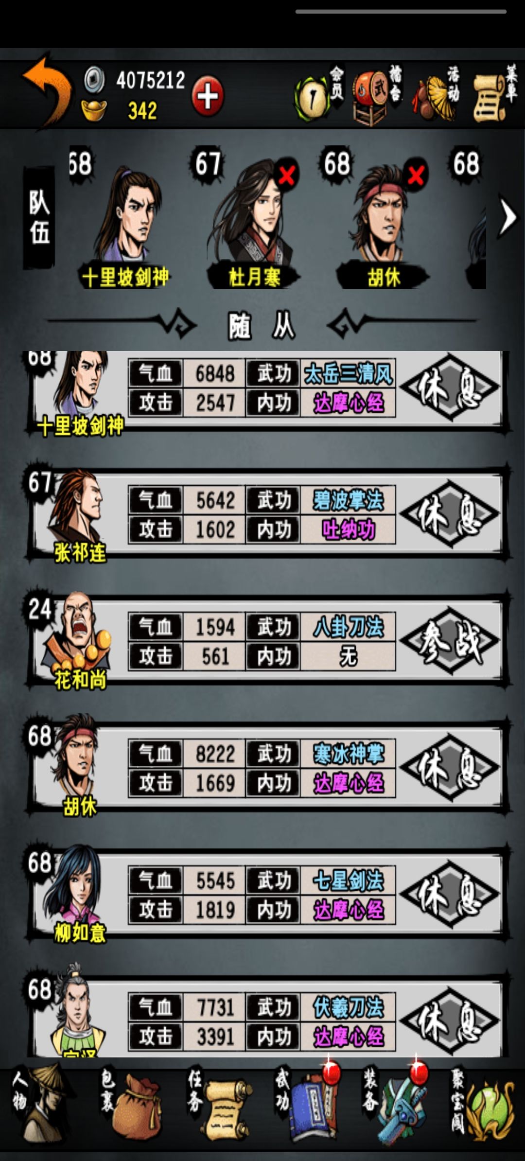 现在一个月了68级,手刷刷的是真恶心人,已经刷吐了,我觉得一个月绝对手刷不到70级,现在首发全达摩,接下来就去华山拿紫霞。,太乙拿个太虚刀就去武当养老,少林的横岗死活拿不到,等以后再说,慢慢搞吧,现在地宫也只能搞到第五关,主线还是在襄阳的魔教