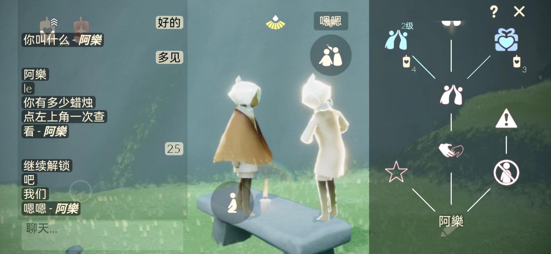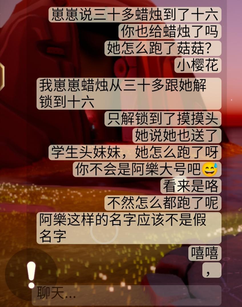 我好友是被我从其他游戏邀请来光遇的,平时不跑图,跟着我们才跑了37根蜡烛左右,今天自己在云野玩时被一个叫阿樂的无翼邀请加好友(p2.3)