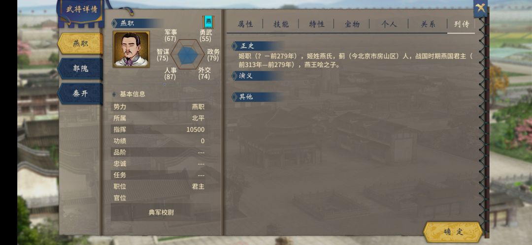 给你们总结一下就是,燕昭襄王——燕职势力,开局三个人三把刀,半年后会有乐毅、瑶瑶公主、甄宓三个特技武将以及黄金台事件中人物,当然要想都获得需要适当SL。
