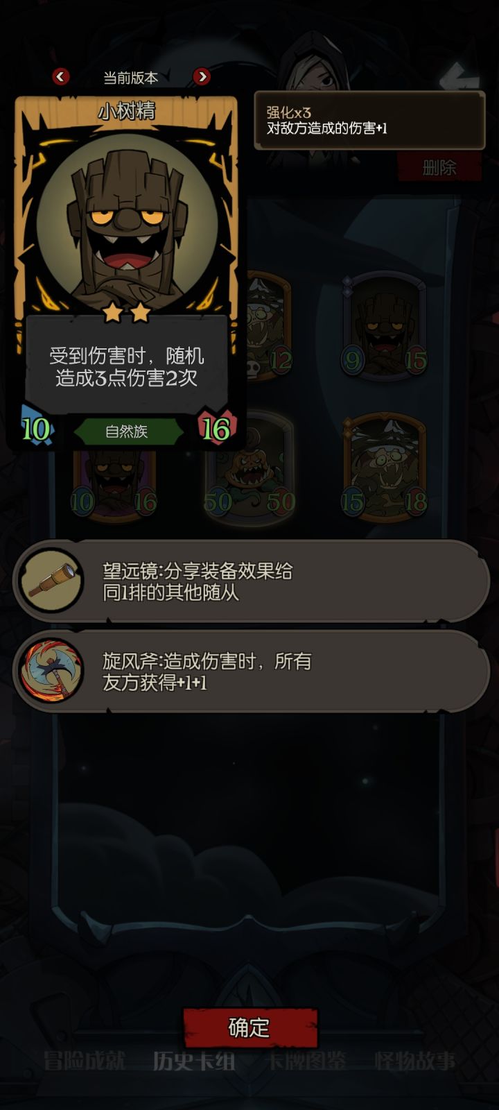 中期要注意拿一个复仇树精用来叠攻击和防御,但是后期可以用望远镜和旋风斧替换