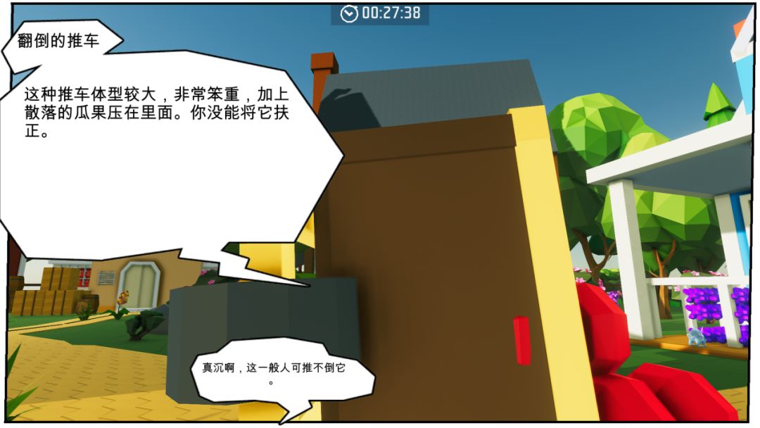 离开机器人车间后,会发现门口倒着一辆运瓜的车。试着扶正它,并得出“一般人无法推倒它”的结论。