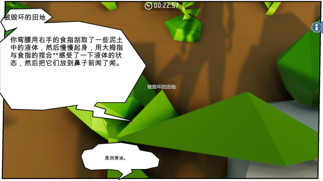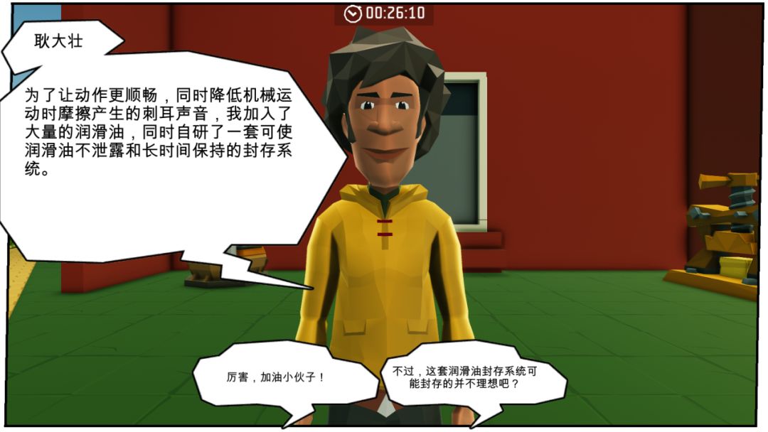 继续向里面探索时,“耿大壮”突然出现,随着与其深入交流,发现他的机器人有用到“润滑油”并且具有破坏农田的可能性。