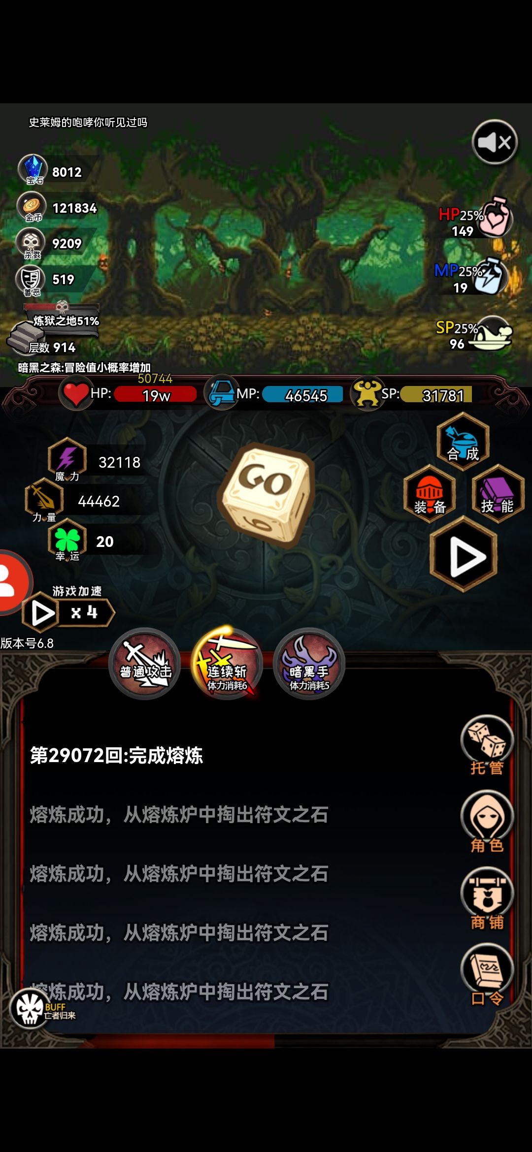 然后2000层做个大喵,顺便做下末日启示,如果想贪点属性可以再做个鲲换九尾。就可以安心玩到4000层了。这时我们技能换成连续斩,然后就只要叠叠幸运,吃吃消耗品就行了,顺便合个兔子神灯。