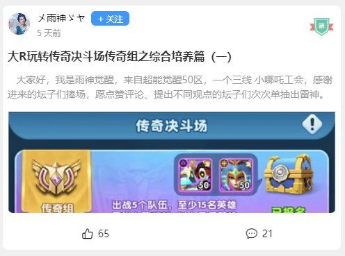 说到PVP玩法,那必须是竞技场了。有大神根据自身的冒险经验写出了这篇传奇决斗场传奇组的培养介绍。这篇介绍的英雄阵容和神器的要求较高,比较推荐高阶玩家尝试。当然初级玩家也可以参考下大神的思路和想法,调整自己的英雄培养重心。
