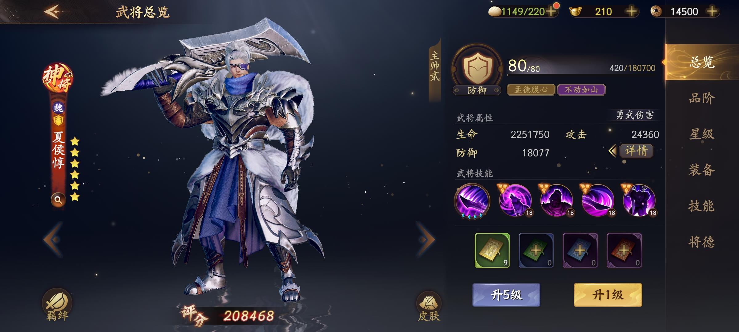 被动技——忿恨 战斗中,己方每上阵一支步兵兵团,夏侯惇的最大生命值便增加9%