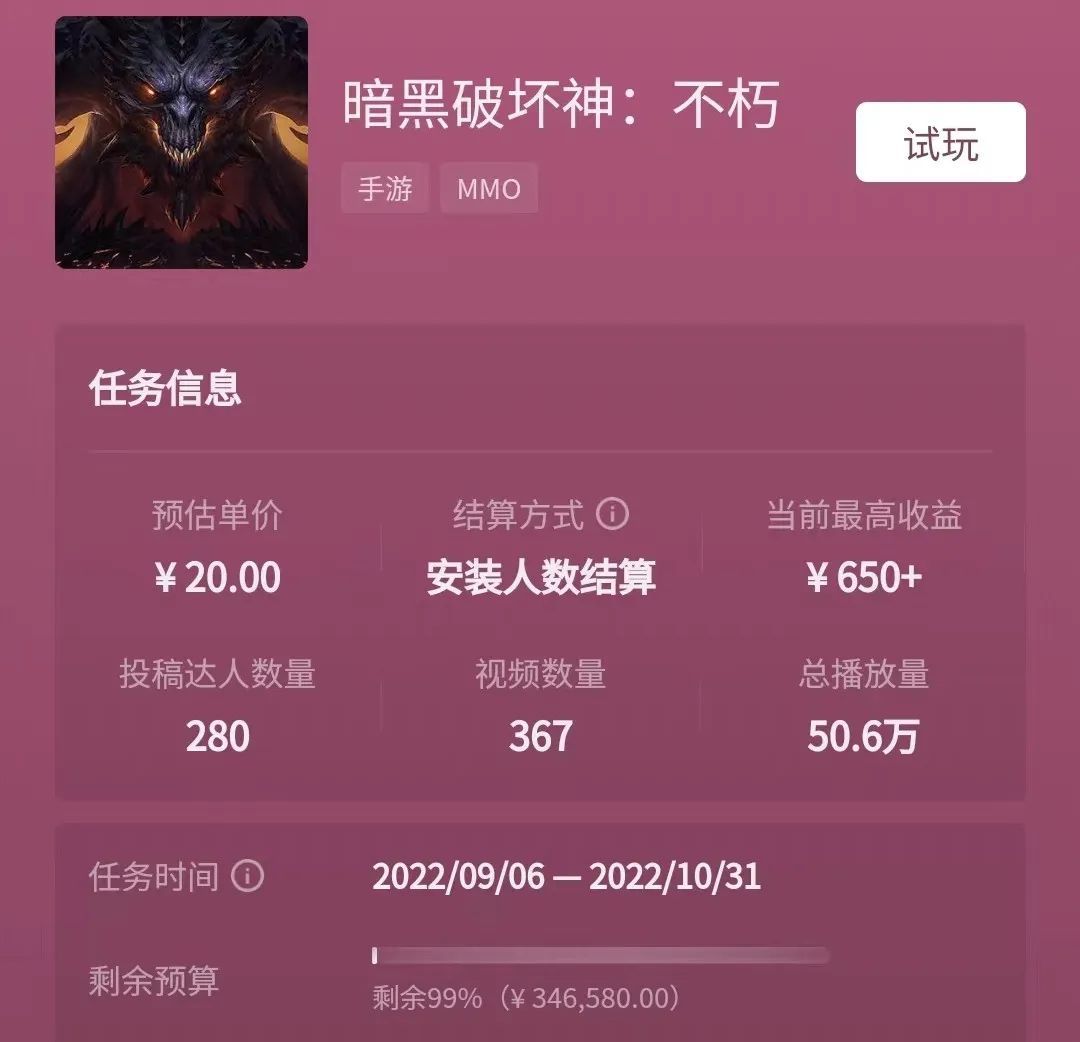 7月30号,《暗黑:不朽》加入抖音游戏发行人计划,投入40万元的预算,为期1个月。到期后,9月6号重上,预估单价从10元翻倍至20。